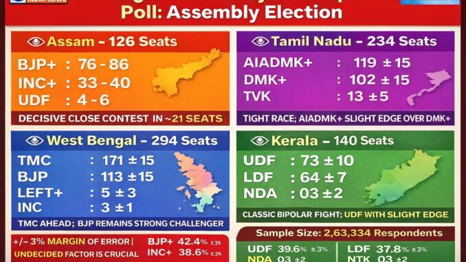 NewDelhi: Date: 7th April 2026 As the political temperature rises ahead of the 2026 Assembly Elections, the latest Shining India Survey covering Assam, Tamil Nadu, West Bengal, and Kerala presents a detailed snapshot of voter sentiment, alliance strength, and emerging electoral dynamics.