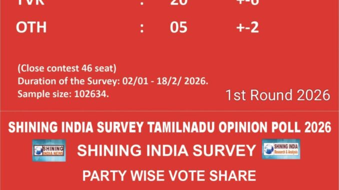 Chennai | The latest Shining India Survey and Shining India news– Tamil Nadu Opinion Poll 2026 indicates a highly competitive electoral battle in the state, with no alliance currently positioned for a decisive majority. The survey suggests a close triangular contest and several constituencies likely to play a decisive role in government formation.