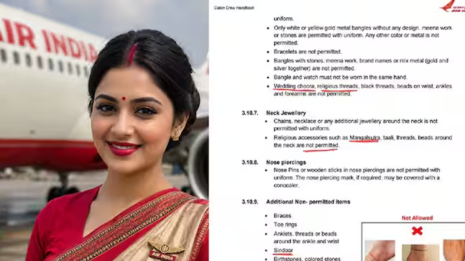 NewDelhi: The Lenskart store manual sparked a fire on social media, and its flames have just engulfed Air India. The airline is now facing the ire of social media users after its manual for cabin crew went viral. The social media users flagged that the manual prevents staff from wearing bindi, tilak, kalawa, and mangalsutra. The manual also bars staff from wearing black thread, nose pins, and anklets, among other items.